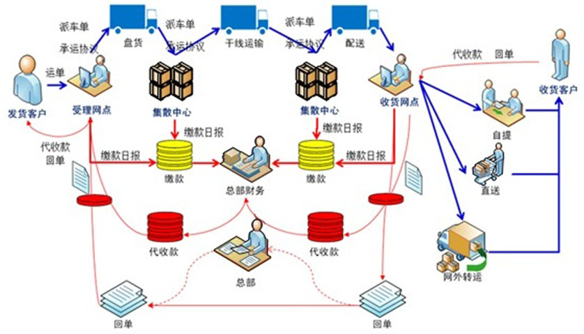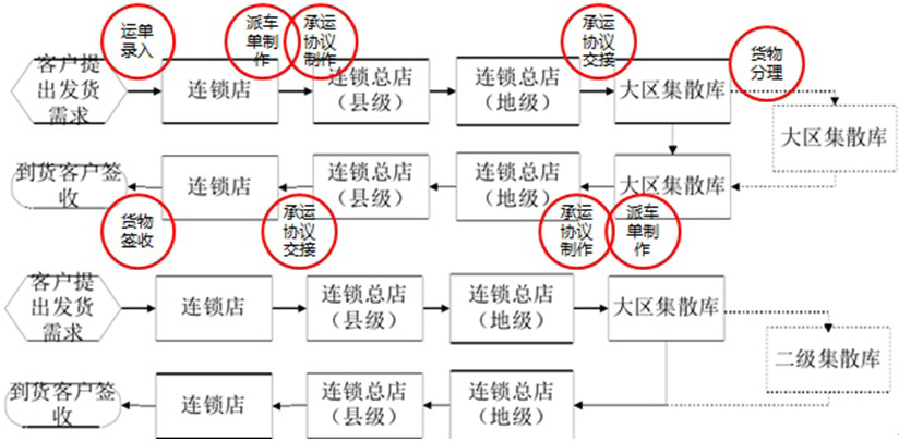 實現零擔運輸的整合運營,規范零擔物流運營的操作流程,提升零擔運輸的綜合服務能力。零擔運輸基本采用軸輻式路由,以實際應用說明其運作流程。