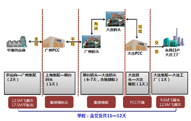 作為東風日產“北上”戰略的重要布局,大連工廠與現有的廣州、襄陽、鄭州三大生產基地實現了東風日產南北縱橫全新格局。首款P32R車型是作為平衡車型在大連、鄭州兩地生產,供應商多數落戶在華北、華東地區,迫切需要解決從南方向大連長途運輸的課題,而且需要盡可能削減長途運輸帶來的昂貴調達物流費用。同時,大連工廠地處大連保稅區,如何充分利用便利的海運物流條件,實現南北海運對流降低成本成為了工廠投產前重要的創新課題。