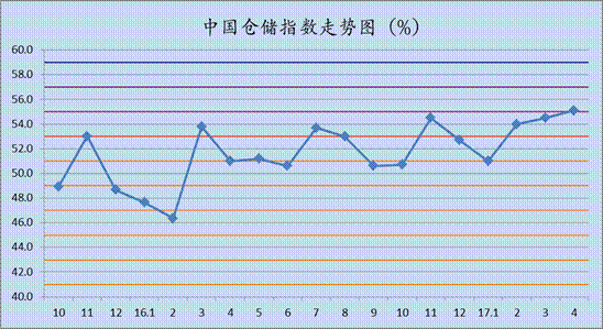 中國物流與采購聯合會與中儲發展股份有限公司聯合調查的2017年4月中國倉儲指數為55.1%,較上月回升0.6個百分點,連續十四個月位于擴張區間。各分項指數中,設施利用率指數、收費價格指數、主營業務成本指數、期末庫存指數及企業員工指數較上月有所回升,其余指數均有不同程度的回落。