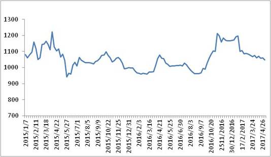 圖 1 2015-2017年各周中國公路物流運(yùn)價指數(shù)