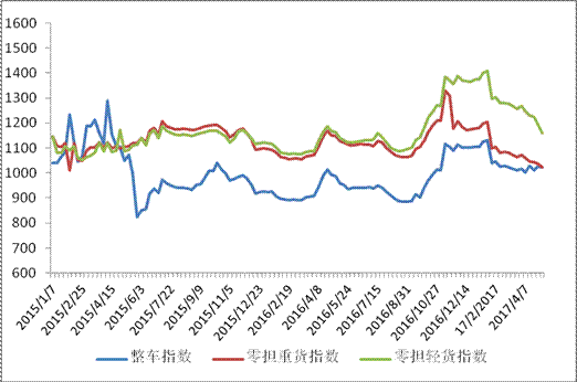 各車型指數(shù)均有不同程度回落。其中,零擔(dān)指數(shù)回落幅度高于整車指數(shù)指數(shù)。在零擔(dān)指數(shù)中,零擔(dān)輕貨指數(shù)回落幅度明顯高于零擔(dān)重貨指數(shù)。本周,整車指數(shù)為1022.6點(diǎn),環(huán)比回落0.3%,比年初回落7.4%;零擔(dān)輕貨指數(shù)為1160.1點(diǎn),環(huán)比回落2.9%;零擔(dān)重貨指數(shù)為1021.7點(diǎn),環(huán)比回落1.6%。