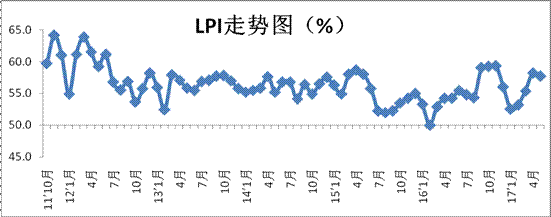 中國物流與采購聯(lián)合會(huì)發(fā)布的2017年5月份中國物流業(yè)景氣指數(shù)為57.7%較上月回落0.5個(gè)百分點(diǎn);中國倉儲(chǔ)指數(shù)為52.4%,較上月回落2.7個(gè)百分點(diǎn);中國公路物流運(yùn)價(jià)指數(shù)為106.33點(diǎn),比上月回升0.07%;中國電商物流運(yùn)行指數(shù)同比指數(shù)為121點(diǎn),比上月小幅回落0.1點(diǎn)。