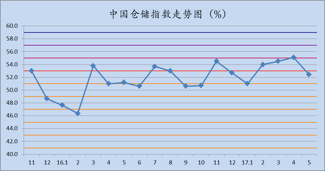 中國物流與采購聯(lián)合會與中儲發(fā)展股份有限公司聯(lián)合調(diào)查的2017年5月中國倉儲指數(shù)為52.4%,較上月回落2.7個百分點,連續(xù)十五個月位于擴張區(qū)間。各分項指數(shù)中,延伸業(yè)務(wù)量指數(shù)與上月持平,業(yè)務(wù)量指數(shù)、收費價格指數(shù)、業(yè)務(wù)利潤指數(shù)較上月有所回升,其余指數(shù)均有不同程度的回落。