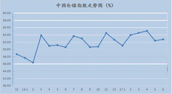 中國物流與采購聯合會與中儲發展股份有限公司聯合調查的2017年6月中國倉儲指數為52.7%,較上月回升0.3個百分點,連續十六個月位于擴張區間。各分項指數中,業務量指數與上月持平,業務利潤指數、期末庫存指數、企業員工指數較上月有所回升,其余指數均有不同程度的回落。