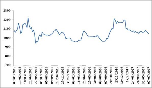 圖 1 2015-2017年各周中國(guó)公路物流運(yùn)價(jià)指數(shù)