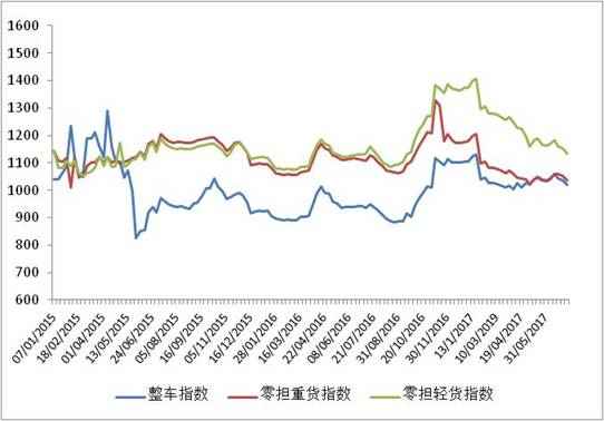 各車型指數(shù)均有所回落,零擔(dān)指數(shù)回落幅度略高于整車指數(shù),零擔(dān)指數(shù)中輕貨指數(shù)回落幅度略高于重貨指數(shù)。其中,整車指數(shù)為1020.6點(diǎn),環(huán)比回落1.58%,但仍比上年同期增長(zhǎng)8.9%;零擔(dān)輕貨指數(shù)為1132.9點(diǎn),環(huán)比回落1.76%;零擔(dān)重貨指數(shù)為1036.1點(diǎn),環(huán)比回落1.6%。