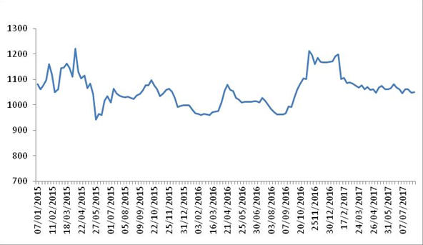 圖 1 2015-2017年各周中國公路物流運(yùn)價(jià)指數(shù)