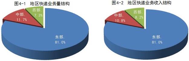 1-7月,東、中、西部地區(qū)快遞業(yè)務量比重分別為81%、11.7%和7.3%,業(yè)務收入比重分別為81%、10.8%和8.2%。與去年同期相比,東部地區(qū)快遞業(yè)務量比重下降了0.2個百分點,快遞業(yè)務收入比重下降了0.2個百分點;中部地區(qū)快遞業(yè)務量比重下降了0.1個百分點,快遞業(yè)務收入比重上升了0.1個百分點;西部地區(qū)快遞業(yè)務量比重上升了0.3個百分點,快遞業(yè)務收入比重上升了0.1個百分點。