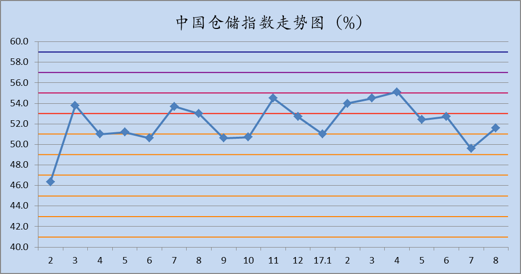 中國物流與采購聯合會與中儲發展股份有限公司聯合調查的2017年8月中國倉儲指數為51.6%,較上月回落2.0個百分點。各分項指數中,設施利用率指數較上月有所回落,平均庫存周轉次數指數與上月持平,其余指數均有不同程度的回升。