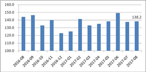 總業務量指數有所回升。8月份,總業務量指數為138.2點,比上月回升0.6點。主要地區中,東北地區和西部地區總業務量指數回升較為明顯,其中東北地區為134.5點,比上月回升2.9點,西部地區為141.8點,比上月回升1.9點;東部和中部地區分別為133.9點和137.9點,比上月回升0.5點和0.8點。