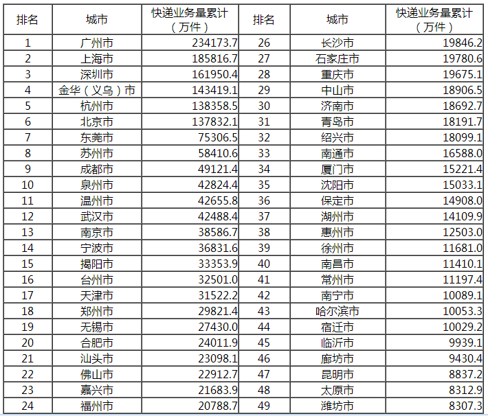 1-8月,全國快遞服務企業業務量累計完成237.9億件,同比增長30.2%;業務收入累計完成2976.9億元,同比增長27%。其中,同城業務量累計完成55.6億件,同比增長25.1%;異地業務量累計完成177.4億件,同比增長31.9%;國際/港澳臺業務量累計完成4.9億件,同比增長31.1%。