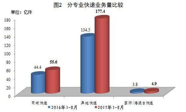 1-8月,同城、異地、國際/港澳臺快遞業務量分別占全部快遞業務量的23.4%、74.5%和2.1%;業務收入分別占全部快遞收入的14.6%、50.9%和10.9%。與去年同期相比,同城快遞業務量的比重下降0.9個百分點,異地快遞業務量的比重上升0.9個百分點,國際/港澳臺業務量的比重基本持平。