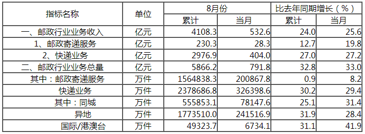 8月份,郵政服務業務總量完成138.4億元,同比增長27.7%;郵政寄遞服務業務量完成20.1億件,同比增長8.2%;郵政寄遞服務業務收入完成28.3億元,同比增長19.8%。