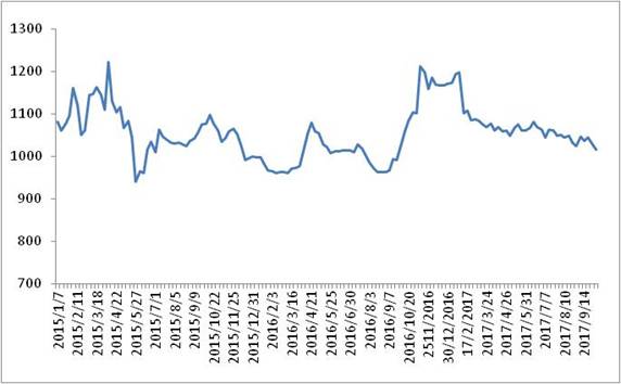 圖 1 2015-2017年各周中國公路物流運(yùn)價(jià)指數(shù)