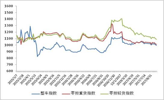 各車型指數(shù)波動(dòng)幅度較小但均有不同程度回落,零擔(dān)指數(shù)回落幅度高于整車指數(shù),在零擔(dān)指數(shù)中零擔(dān)重貨指數(shù)回落幅度高于零擔(dān)輕貨指數(shù)。其中,整車指數(shù)為1008.3點(diǎn),比上周回落1.34%,比上年同期增長6.94%;零擔(dān)輕貨指數(shù)為1103.3點(diǎn),環(huán)比回落1.38%;零擔(dān)重貨指數(shù)為1021.4點(diǎn),環(huán)比回落0.73 %。