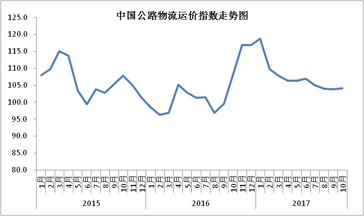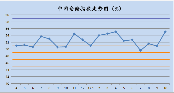 中國物流與采購聯合會發布的2017年10月份中國物流業景氣指數為54%較上月回落0.3個百分點;中國倉儲指數為55.1%,較上月回升4.2個百分點;中國公路物流運價指數為104.08點,比上月回升0.18%;中國電商物流運行指數同比指數為122.3點,比上月回升1.3點。