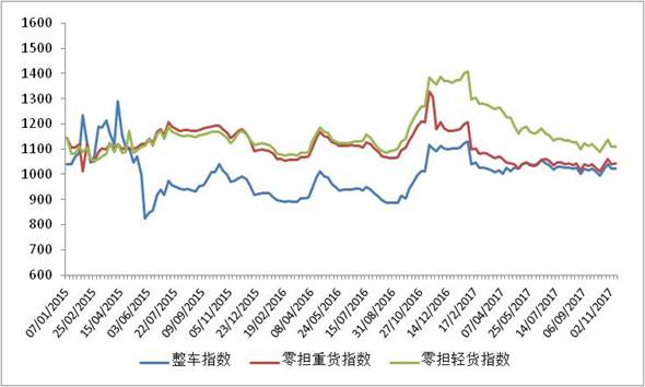 各車型指數均有不同程度回升,整車指數回升幅度略高于零擔指數。在零擔指數中,零擔重貨指數回升幅度高于零擔輕貨指數。其中,整車指數為1023.47點,比上周回升0.23%;零擔輕貨指數為1110.98點,環比回升0.01%;零擔重貨指數為1041.87點,環比回升0.21%。