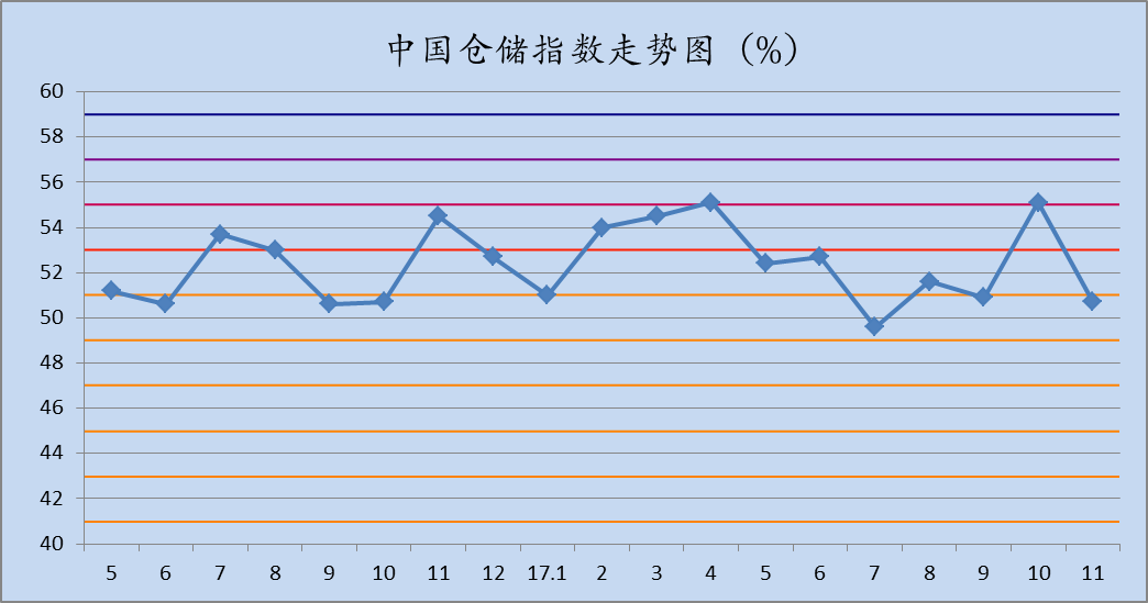 中國物流與采購聯合會與中儲發展股份有限公司聯合調查的2017年11月中國倉儲指數為50.7%,較上月回落4.4個百分點。各分項指數中,除延伸業務量指數、企業員工指數較上月有所回升外,其余指數均有不同程度的回落。