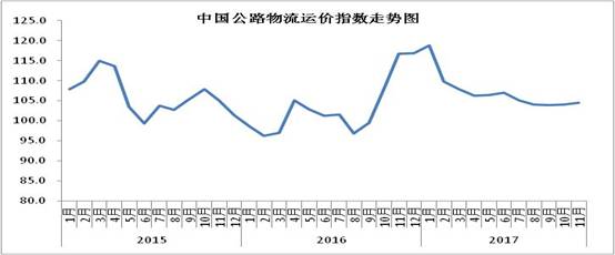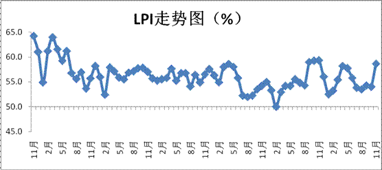 中國(guó)物流與采購(gòu)聯(lián)合會(huì)發(fā)布的2017年11月份中國(guó)物流業(yè)景氣指數(shù)為58.6%較上月回升4.6個(gè)百分點(diǎn);中國(guó)倉(cāng)儲(chǔ)指數(shù)為50.7%,較上月回落4.4個(gè)百分點(diǎn);中國(guó)公路物流運(yùn)價(jià)指數(shù)為104.5點(diǎn),比上月回升0.4%。