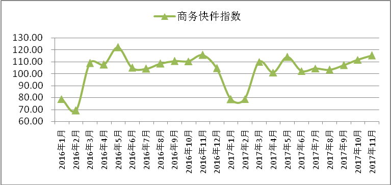 成本水平升幅收窄。11月份,成本指數為101.6%,比上月下降0.9個百分點,反映出11月份快件業務量增速超過了成本投入,單票快件的直接成本增速較10月份有所收窄。