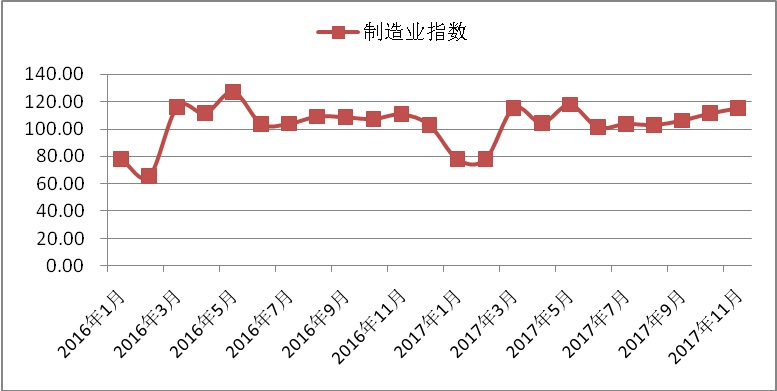 制造業中裝備制造業增長較快。11月份電氣機械、計算機制造業商務快件指數分別達到119.3%和109.6%,而黑色金屬冶煉、有色冶煉和化學工業指數偏低,僅為97.2%、98.3%和98.9%,反映出制造業中裝備制造業活動加快,鋼鐵和有色及化工行業活動有所放緩,制造業發展動能在轉換。此外,與居民生活相關的農副食品加工、服裝制造業、木材及家具制造業商務快件指數達到126.9%、138.6%和114.5%,與金九銀十雙十一期間,食品、服裝和家具建材的促銷有一定關系。