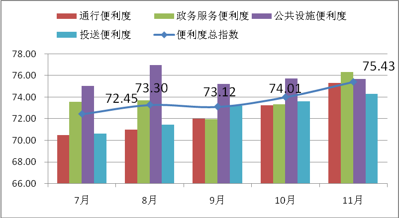 外部環境整體趨好。11月份,便利度指數為75.4%,比上月回升1.4個百分點,其中通行和政務服務明顯改善。從分項來看,通行便利度指數為75.3%,比上月提高2.1個百分點,政務服務便利度指數為76.4%,比上月提高3個百分點,公共設施便利度指數為75.7%,比上月下降0.1個百分點,投送便利度指數為74.3%,比上月提高0.7個百分點。