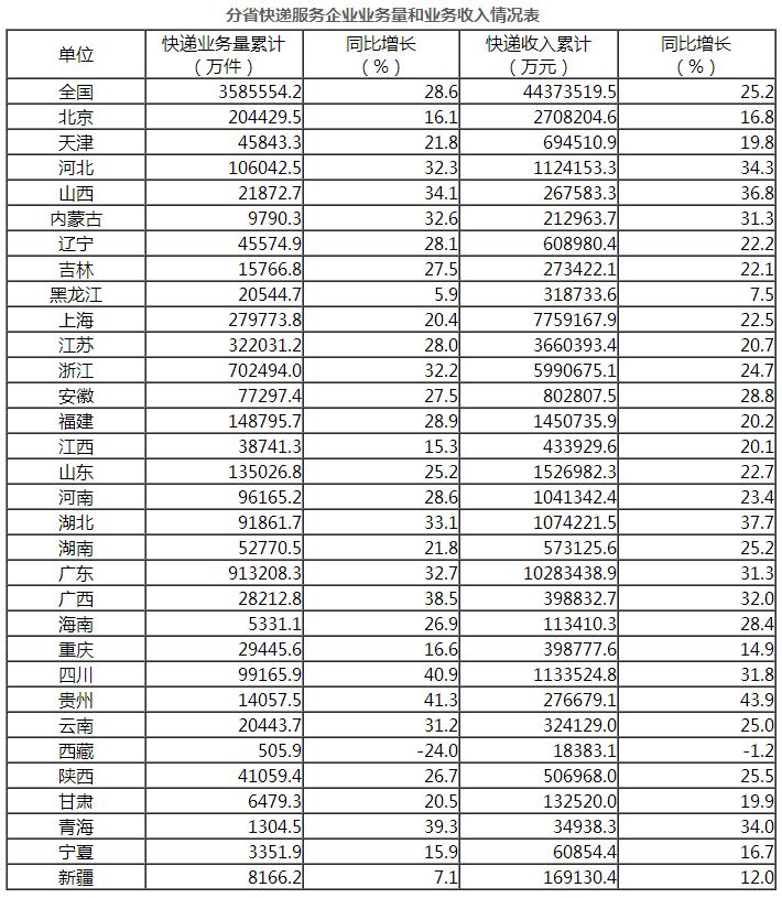 11月份,全行業(yè)業(yè)務收入完成699.3億元,同比增長22.6%;業(yè)務總量完成1114.2億元,同比增長31.5%。