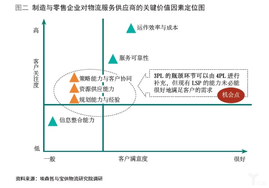 我們認為,這種新需求是企業內部成本控制的外在表現,是剛性需求。由調研結果進一步分析企業對物流服務供應商(LSP)價值因素的關注度與滿意度二維矩陣(見圖二),在運作效率和成本、服務可靠性與人員能力這些傳統業務需求上,第三方物流供應商仍能扮演稱職的角色,但針對供應鏈策略能力、客戶協同能力、資源供應整合能力這三項新關注的需求,企業對LSP的滿意度相對偏低,凸顯了現今第三方物流業務瓶頸與能力的局限性,也代表第四方物流企業新的契機。
