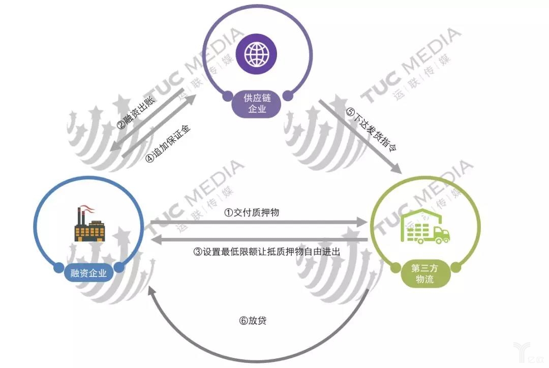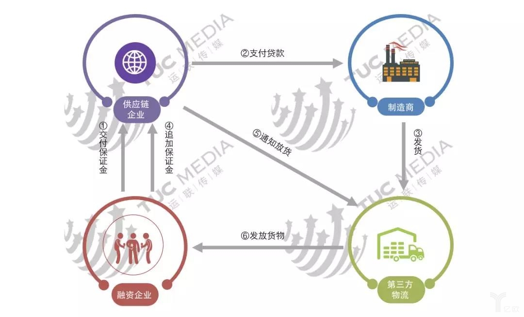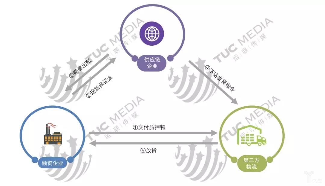 目前國內(nèi)供應(yīng)鏈貿(mào)易企業(yè)常用的方式為先票/款后貨貸款,其擔(dān)保的基礎(chǔ)為采購方對制造商的提貨權(quán)。供應(yīng)鏈參與主體共同簽訂協(xié)議,供應(yīng)鏈企業(yè)通過代付采購款方式對融資企業(yè)融資,第三方物流作為庫存貨的監(jiān)管方對庫存進(jìn)行監(jiān)管。