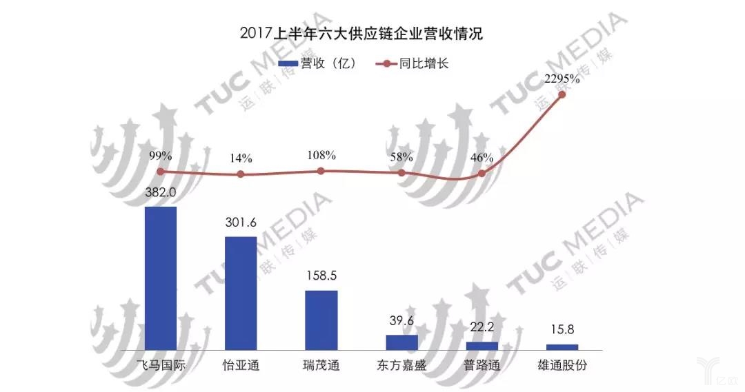 大型供應(yīng)鏈企業(yè)以物流為基礎(chǔ),深化“1+N”供應(yīng)鏈模式,打造供應(yīng)鏈金融生態(tài),規(guī)模快速擴(kuò)張。下圖為2017年上半年六大供應(yīng)鏈企業(yè)營收情況: