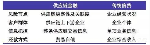 供應(yīng)鏈金融與傳統(tǒng)信貸最大的差別在于,利用供應(yīng)鏈中核心企業(yè)的資信能力,基于交易過程向核心企業(yè)和其上下游相關(guān)企業(yè)提供綜合金融服務(wù)。在風(fēng)險節(jié)點、客戶群體、信息把控、還款方式方面有本質(zhì)區(qū)別。