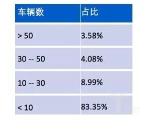 這張圖是根據(jù)我之前東家的數(shù)據(jù)來的——大概有4萬多家運(yùn)輸企業(yè)的數(shù)據(jù)。在這4萬多家運(yùn)輸企業(yè)里,大于50臺(tái)車的占3.58%,有30到50臺(tái)車的占4%,有10到30臺(tái)車的為8.99%,小于10臺(tái)的則是83.35%。