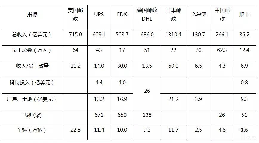 2016年,我國快遞業(yè)務(wù)收入為602億美元,僅為當年美國的1/4。從單個企業(yè)來看,日本郵政員工人均收入(營業(yè)收入/員工人數(shù))最高,為中國郵政的員工人均收入15倍左右。收入差距之高與企業(yè)在人力和科技等要素投入有關(guān)。綜合實力的較量已經(jīng)成為企業(yè)未來發(fā)展的關(guān)鍵,強大的航空和陸上運力資源、大規(guī)模的配送網(wǎng)絡(luò)和中轉(zhuǎn)中心,擁有整合其他物流網(wǎng)絡(luò)的能力以及在業(yè)務(wù)區(qū)域內(nèi)快速有效的通關(guān)能力,輔以先進的實時跟蹤和運營控制計算機技術(shù),才能在這一領(lǐng)域立足。順豐2016年在科技方向投入僅為UPS的1/5,日本郵政在廠房和土地方面的投入為順豐的2倍多,UPS的飛機數(shù)量為中國郵政的25倍,美國郵政的運輸車輛為順豐的14倍。我國郵政業(yè)雖然相對成熟的國外企業(yè)發(fā)展迅速,但企業(yè)綜合實力的提升才是未來競爭的關(guān)鍵。