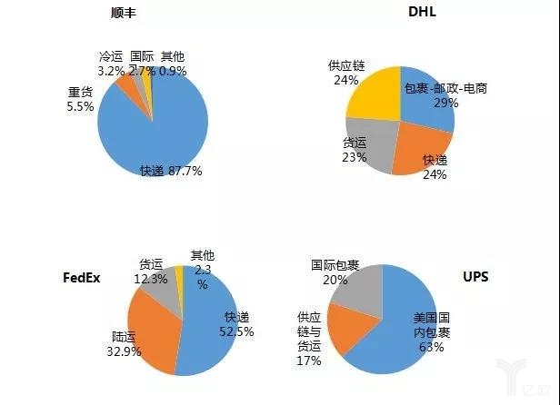 德國郵政DHL服務(wù)功能分配最均衡,UPS和FDX雖然都有綜合性物流業(yè)務(wù)但仍然偏重快遞業(yè)務(wù)。國內(nèi)最先進的順豐,重貨、冷鏈、國際等新興業(yè)務(wù)占比僅為11.4%。