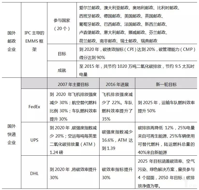 IPC于2008年設(shè)定環(huán)境監(jiān)測和測量系統(tǒng)(EMMS)框架,目前已有20個國家的郵政企業(yè)參與,承諾到2020年,碳績效指標(CPI)達到20%,碳管理能力(CMP)得分達到90%。2014年,CPI指標提前完成目標,2015年CMP得分已達85%。其中,美國郵政、英國郵政等領(lǐng)軍企業(yè)還在建筑物能源審計、屋頂資產(chǎn)管理、物料采購政策等方面積極作為。三大國際快遞企業(yè)先后于2007年設(shè)定溫室氣體減排目標,提出2020年降低碳強度、提升碳效率、減少碳足跡等一攬子具體指標。經(jīng)過持續(xù)努力,2016年三家企業(yè)都取得了階段性成就,并設(shè)定新一輪目標。
