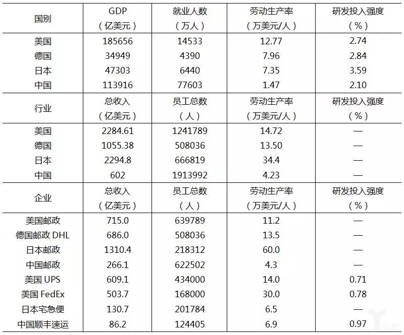中美德日郵政業(yè)勞動生產(chǎn)率、研發(fā)強度及相關(guān)情況對比
