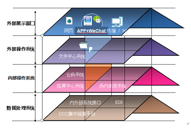 ? CCC集中箱管平臺屬于數(shù)據(jù)處理系統(tǒng),它連接碼頭操作系統(tǒng),通過EDI的方式向船公司客戶輸送集裝箱實時動態(tài)信息。