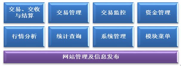 信息平臺為買賣雙方會員的委托提供一個互聯網配對的工具,處理電子商務中買賣雙方下單、撤單、成交、結算、交割、處罰等事宜,同時提供銀行轉賬與物流配送服務系統接口,方便參與買賣會員的資金出入和貨物倉儲配送,并向會員及系統管理和使用人員提供當前的行情及其相關結算信息?;竟δ苣K如下: