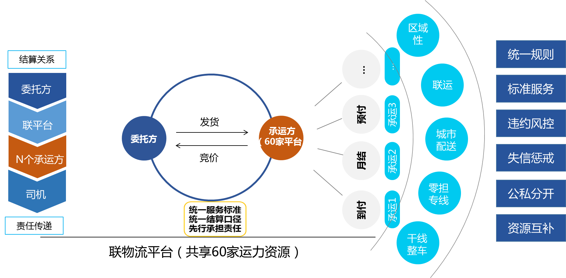 按照設置好的賬號信息,對合同物流以外的臨時物流發貨進行平臺綁定,經過精準對接,幫助集團企業聯接了聯物流平臺60家運力平臺的4家對口平臺進行搶單競價,保證資源補充及充分詢比價。聯平臺通過框架合同的方式統一運力平臺的服務標準、違約賠償責任,傳遞責任,保證風控,統一服務,統一結算,減少原有模式的復雜操作。