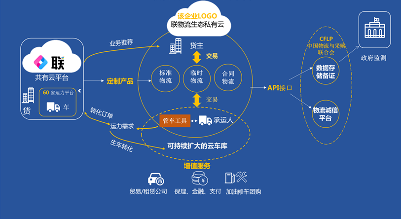 當企業剝離物流業務,形成社會化三方的物流企業進行服務時,聯物流平臺將為集團部署私有云平臺,借助私有云平臺,聚集貨源、整合車源,幫助企業成為平臺生態的聚合者、平臺商業模式的制定者、平臺上最具成本優勢的承運方。做到貨源私有、平臺私有、品牌私有、運力私有、生態私有等。通過私有平臺建立平臺生態,提供包括融資租賃、保險、金融、支付、加油、修車、集采等增值服務,為企業創收。