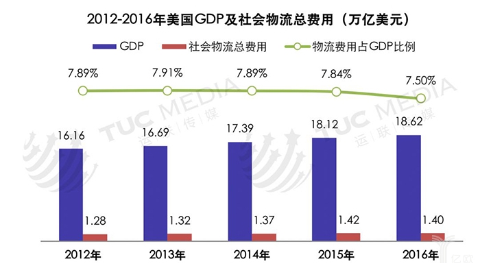 近幾年美國經濟平穩,GDP呈現小幅度增長趨勢,社會物流總費用保持在GDP的8%左右并略微下降,表現較為平穩,物流市場規模短期內不會出現大幅度變化。