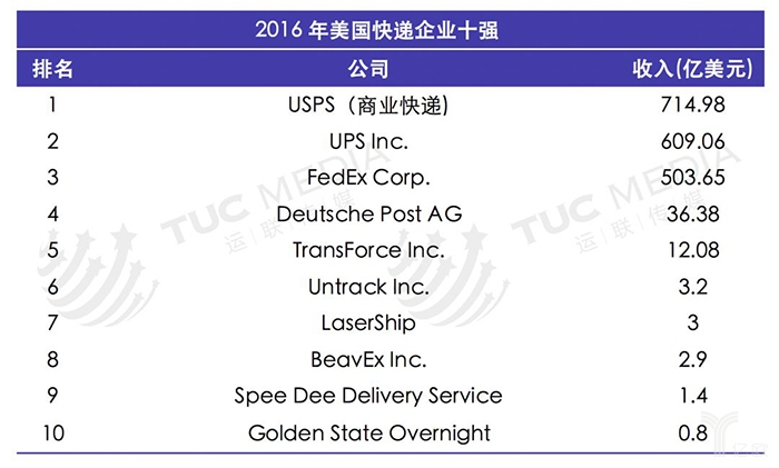 美國快遞行業巨頭壟斷市場現象非常明顯,三大快遞企業USPS(美國郵政)、UPS、FedEx占領美國本土快遞市場份額達90%以上,是行業高度集中化的體現。三大快遞企業實際上業務差異化較為明顯,USPS重商務快遞,UPS重公路運輸,而FedEx走高端路線以空運為主。