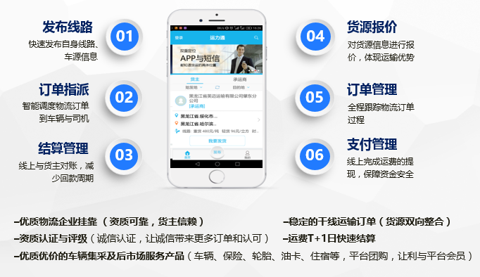 “運力通”平臺提供的運力系統,改變行業實體運輸現狀,提升物流行業在物聯網方面、互聯網方面、移動互聯網方面、信息化方面的軟實力,提升綜合管理能力,優化用戶體驗。