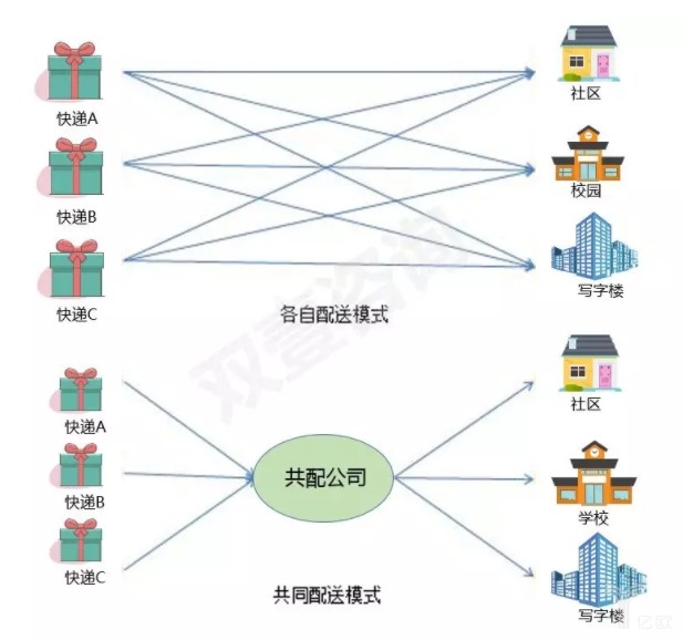 目前市場上關于共同配送尚無統一定義。雙壹認為,快遞行業共同配送是指為了提高配送效率,將多個快件品牌一起進行分揀、投遞、簽收的配送方式。在中國派件難的重點地區,共同配送已經逐漸發展起來。
