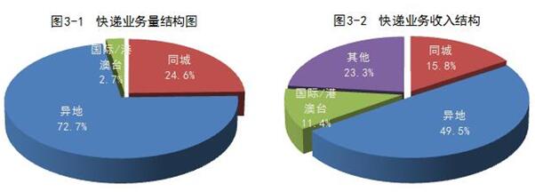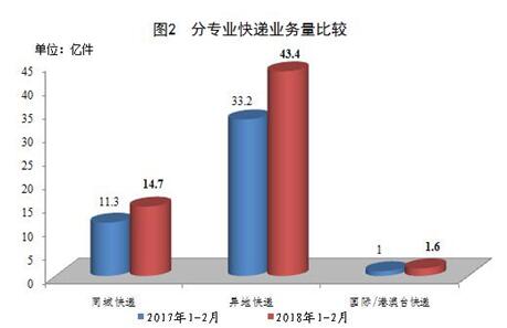 1-2月,同城、異地、國際/港澳臺快遞業(yè)務(wù)量分別占全部快遞業(yè)務(wù)量的24.6%、72.7%和2.7%;業(yè)務(wù)收入分別占全部快遞收入的15.8%、49.5%和11.4%。與去年同期相比,同城快遞業(yè)務(wù)量的比重下降0.2個百分點(diǎn),異地快遞業(yè)務(wù)量的比重下降0.3個百分點(diǎn),國際/港澳臺業(yè)務(wù)量的比重上升0.5個百分點(diǎn)。