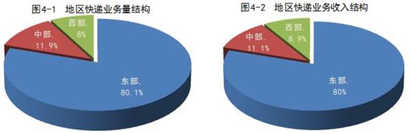 1-2月,東、中、西部地區(qū)快遞業(yè)務(wù)量比重分別為80.1%、11.9%和8%,業(yè)務(wù)收入比重分別為80%、11.1%和8.9%。與去年同期相比,東部地區(qū)快遞業(yè)務(wù)量比重下降了0.1個百分點(diǎn),快遞業(yè)務(wù)收入比重下降了0.4個百分點(diǎn);中部地區(qū)快遞業(yè)務(wù)量比重下降了0.1個百分點(diǎn),快遞業(yè)務(wù)收入比重上升了0.1個百分點(diǎn);西部地區(qū)快遞業(yè)務(wù)量比重上升了0.2個百分點(diǎn),快遞業(yè)務(wù)收入比重上升了0.3個百分點(diǎn)。