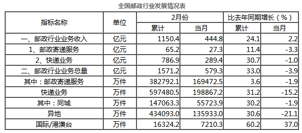 2月份,郵政服務(wù)業(yè)務(wù)總量完成149.4億元,同比增長16.8%;郵政寄遞服務(wù)業(yè)務(wù)量完成16.9億件,同比下降1.9%;郵政寄遞服務(wù)業(yè)務(wù)收入完成27.3億元,同比下降3.3%。