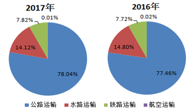 2017年,貨運市場進一步向好,全社會累計完成貨運量471.48億噸,同比增長9.3%,其中鐵路、公路運輸量增長超過10%。在運輸結構上,較上年稍有變化,鐵路貨運量占比較上年增加0.1個百分點。