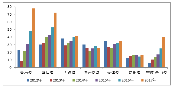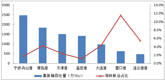 沿海港口鐵水聯(lián)運量呈明顯上升態(tài)勢。2017年前三季度中國港口完成鐵水聯(lián)運量250萬TEU,預計全年鐵水聯(lián)運量將完成320萬TEU左右,同比增速將超過17%,鐵水聯(lián)運量實現(xiàn)快速增長。我國鐵水聯(lián)運量基本上集中在大連、營口、天津、青島、連云港、寧波、深圳鹽田港七個港口,以上港口鐵水聯(lián)運量占全國的90%左右,集中度高。