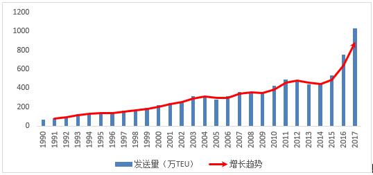圖4 鐵路集裝箱發(fā)送量變化統(tǒng)計(1990-2017年)